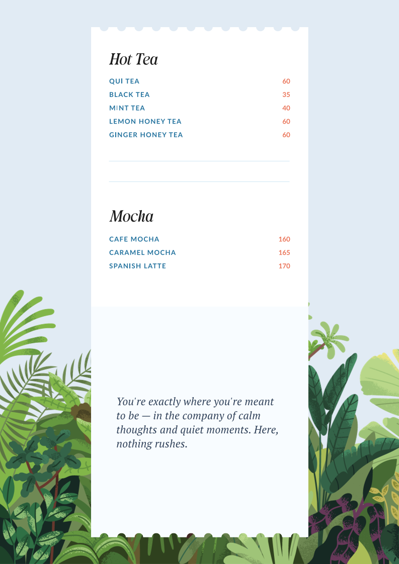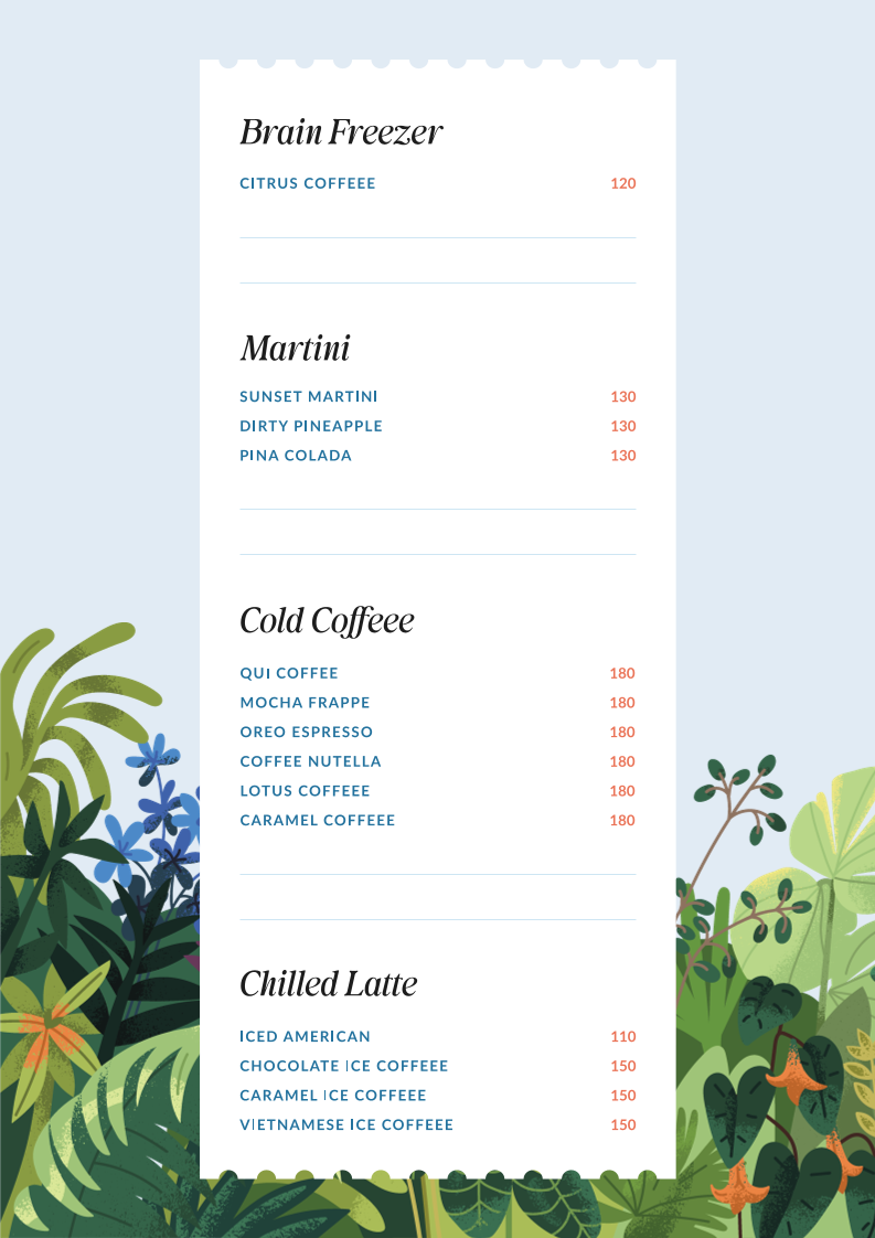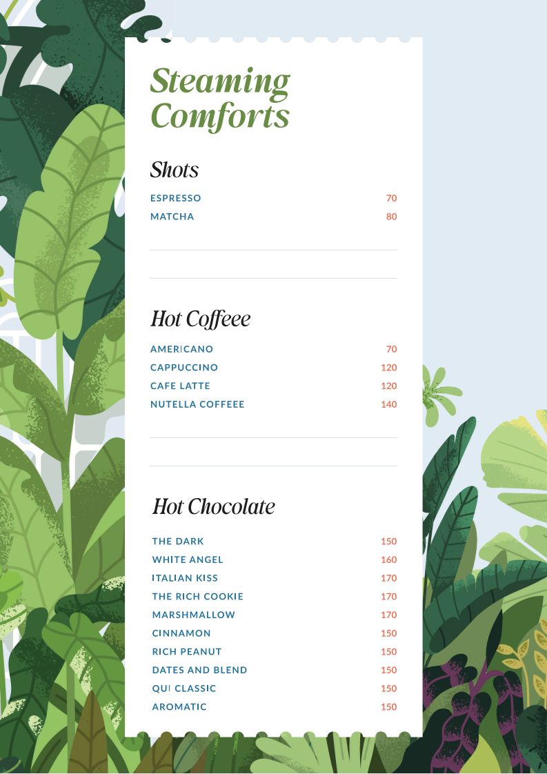 Complementing the food, the drink offerings include a variety of martinis that match the café’s laid-back vibe, perfect for unwinding after a long day or enjoying a quiet night with friends. These drinks bring a subtle vibrancy that fits naturally with the cozy and ambient atmosphere of the space.